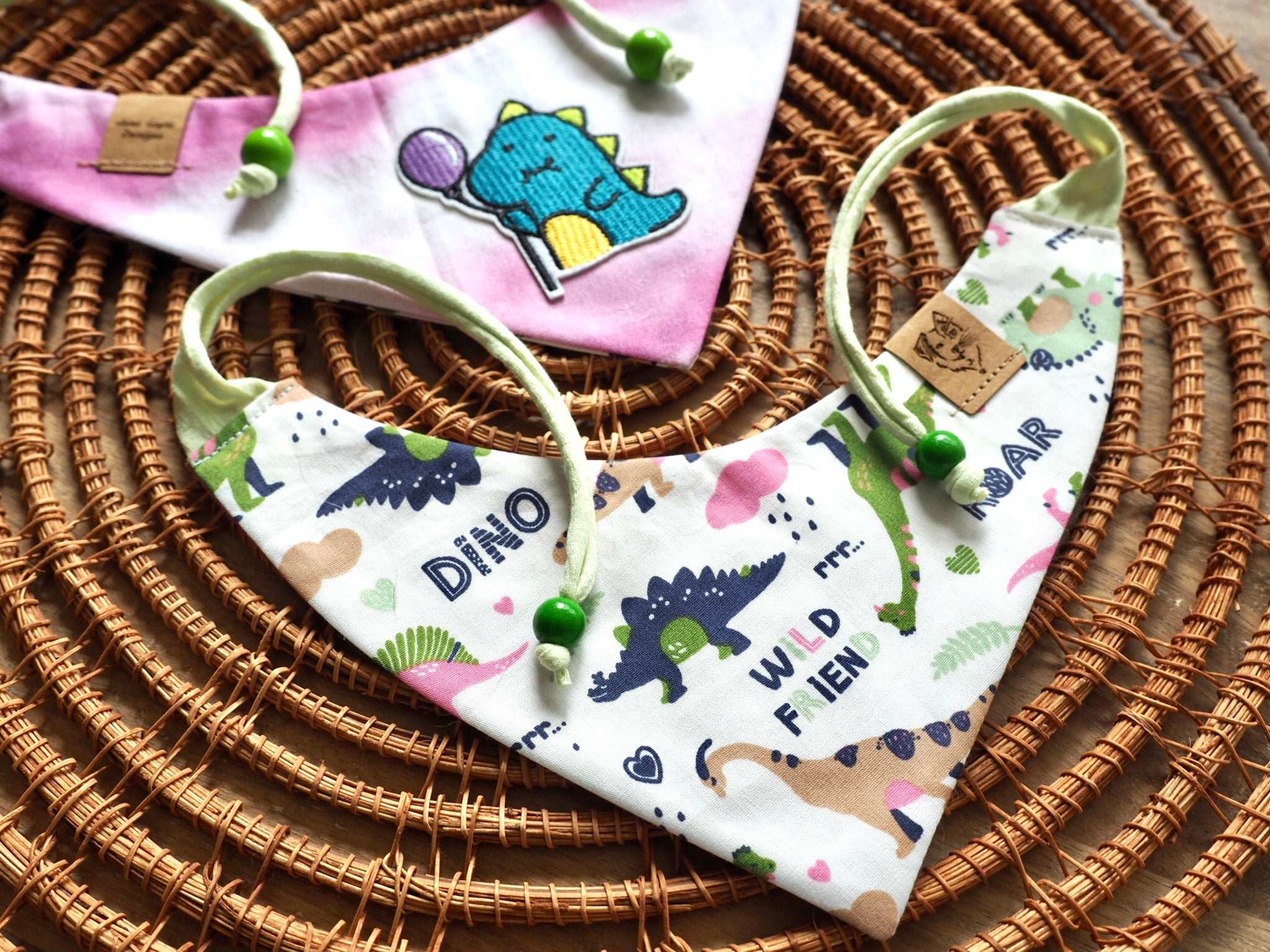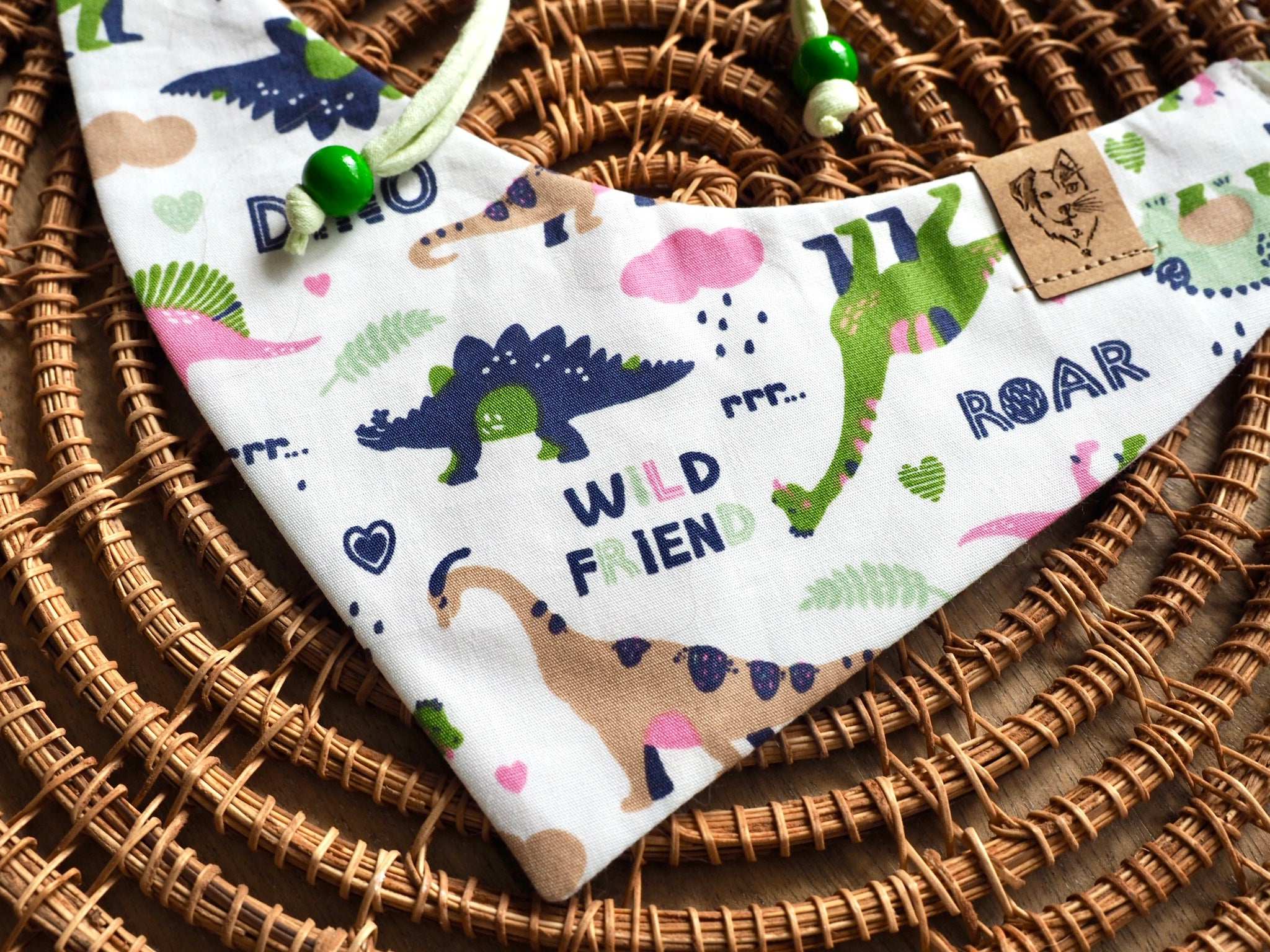 Unsere Hundehalstücher und Katzenhalstücher sind fast alle beidseitig tragbar, so dass ihr immer zwischen zwei tollen Designs wechseln könnt. In diesem Fall habt ihr also die Qual der Wahl zwischen Wild Friends Muster und süßem Dino Patch :)