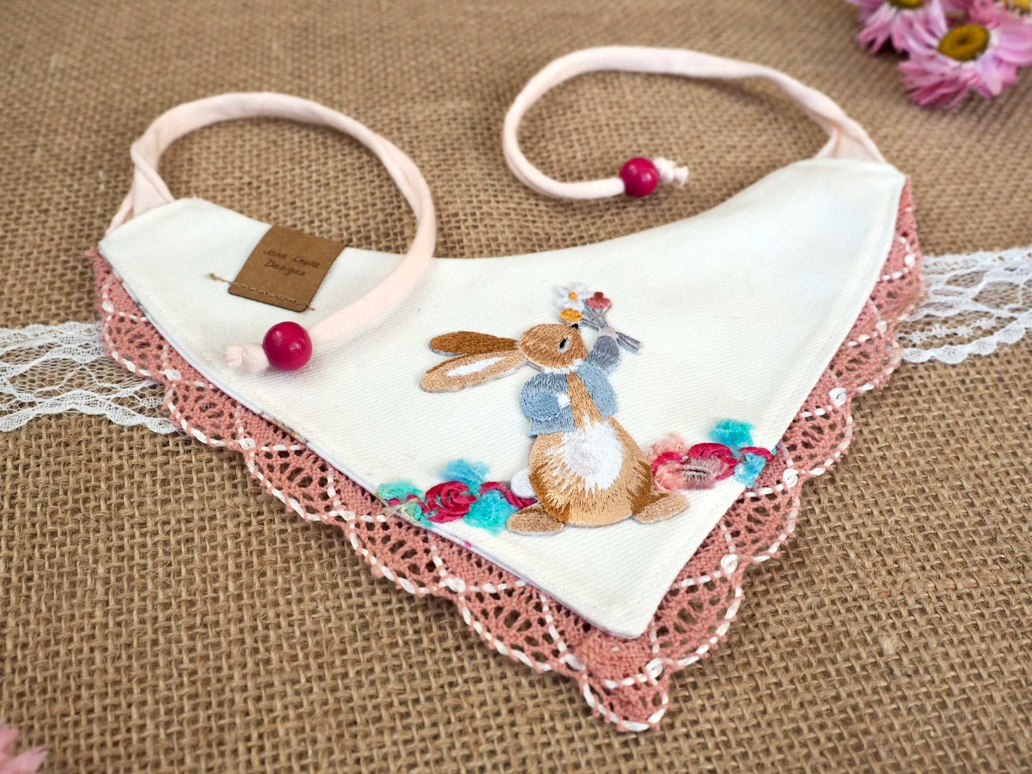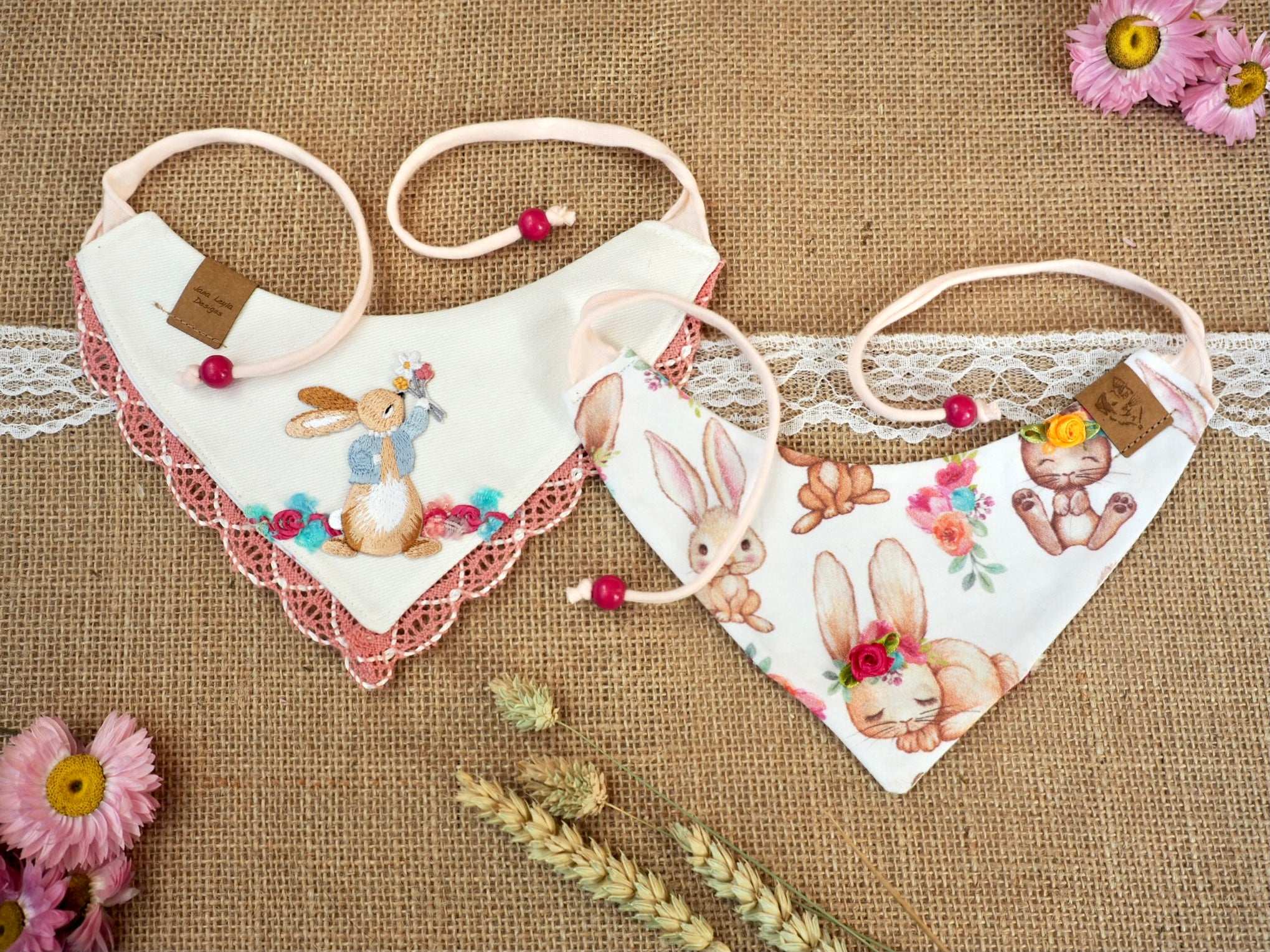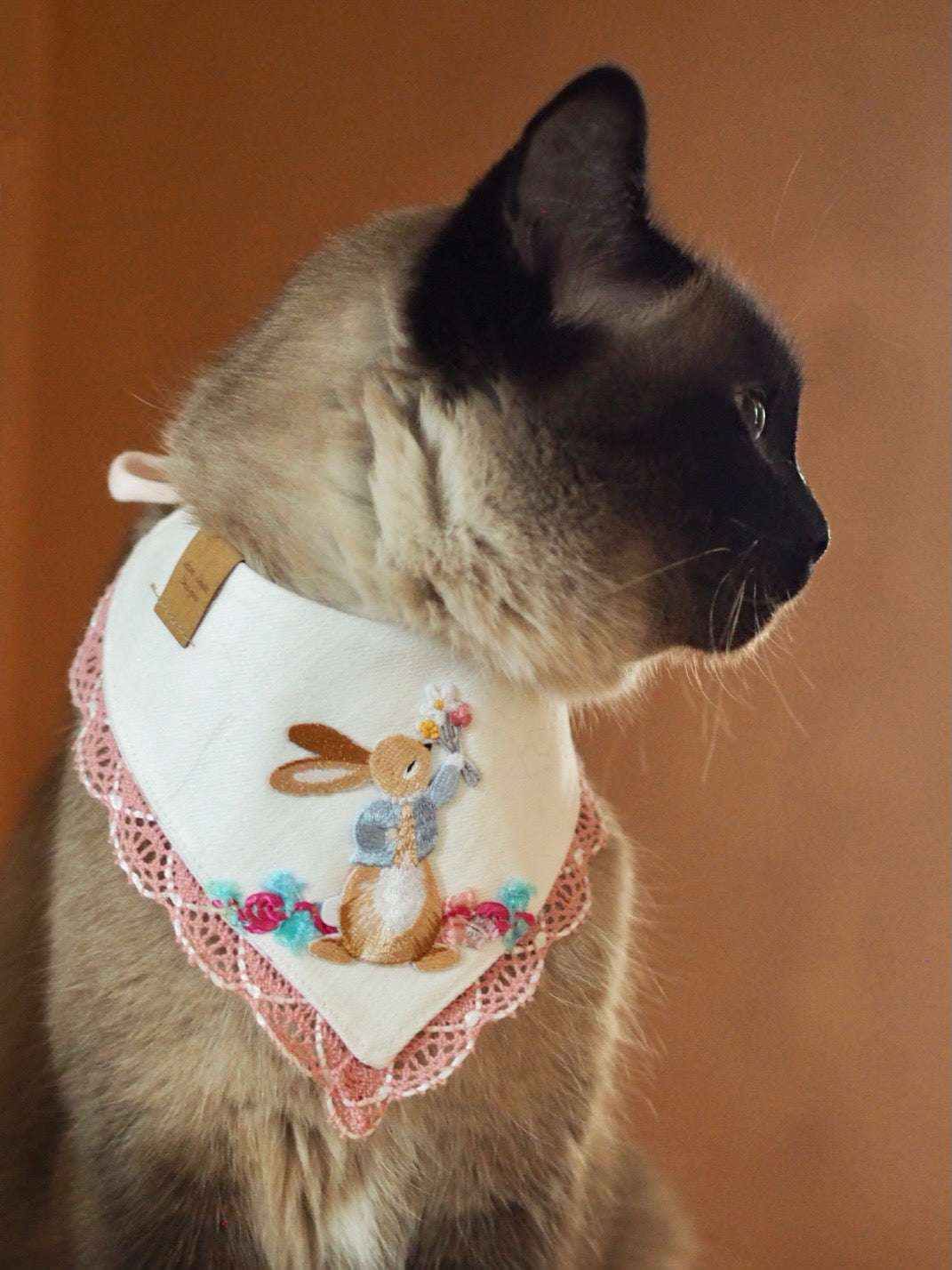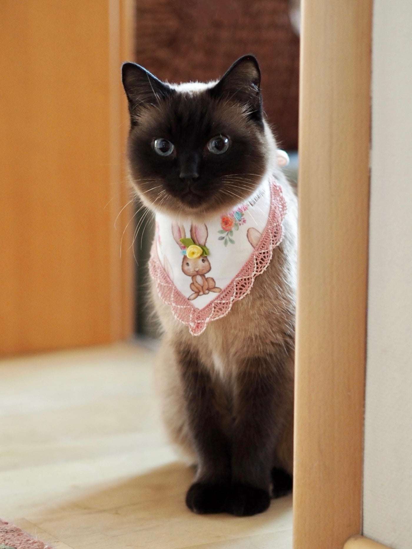 Samtpfoten Leyla und Penny (IG @luckypenny_cat) tragen unser "No bunny but you" Halstuch in der gängigen Katzen-Größe XS. Mainecoon Dame Oria (IG @the_french_coonies) trägt Größe XS/S, passend für etwas größere Katzenrassen.
