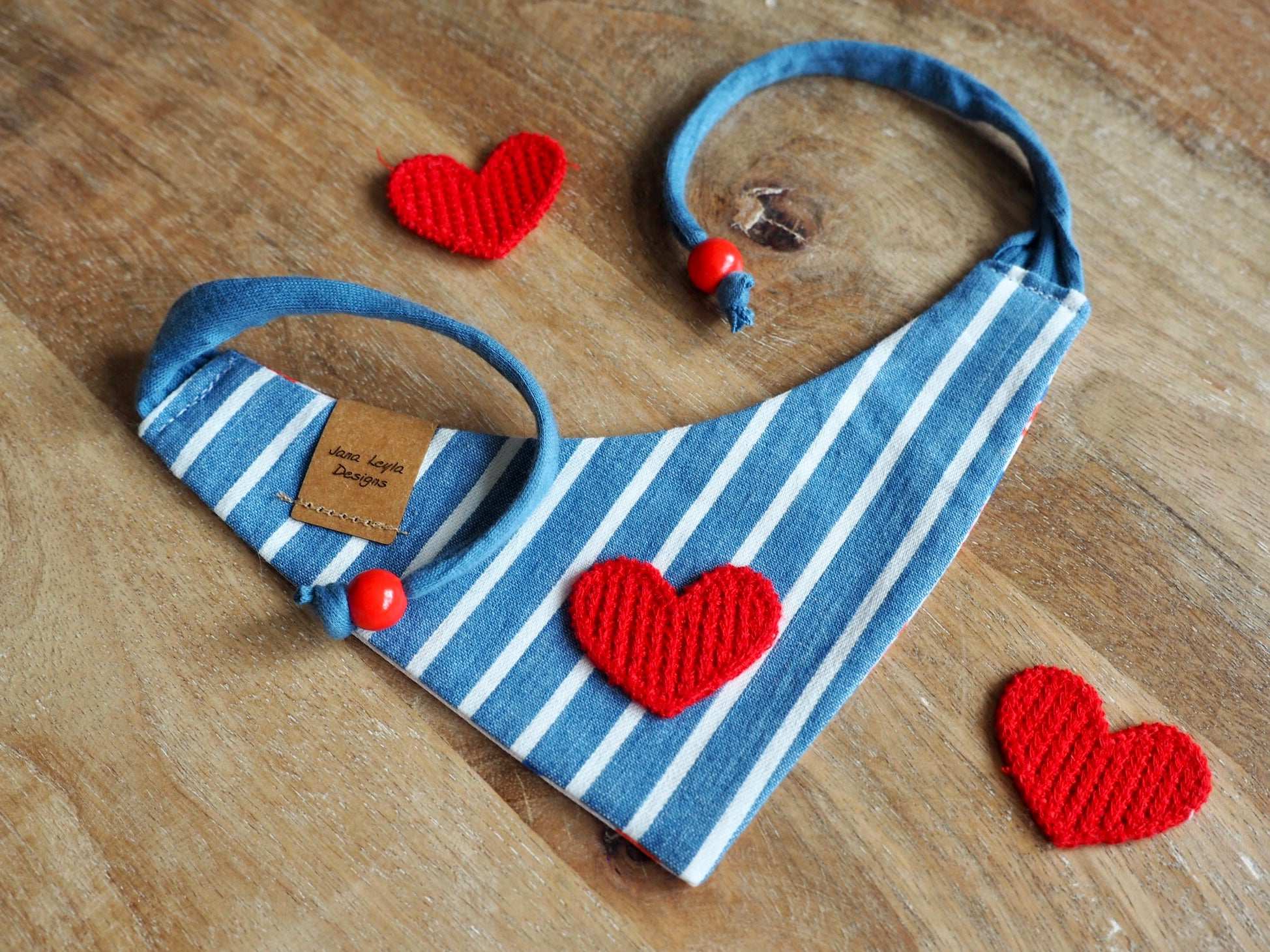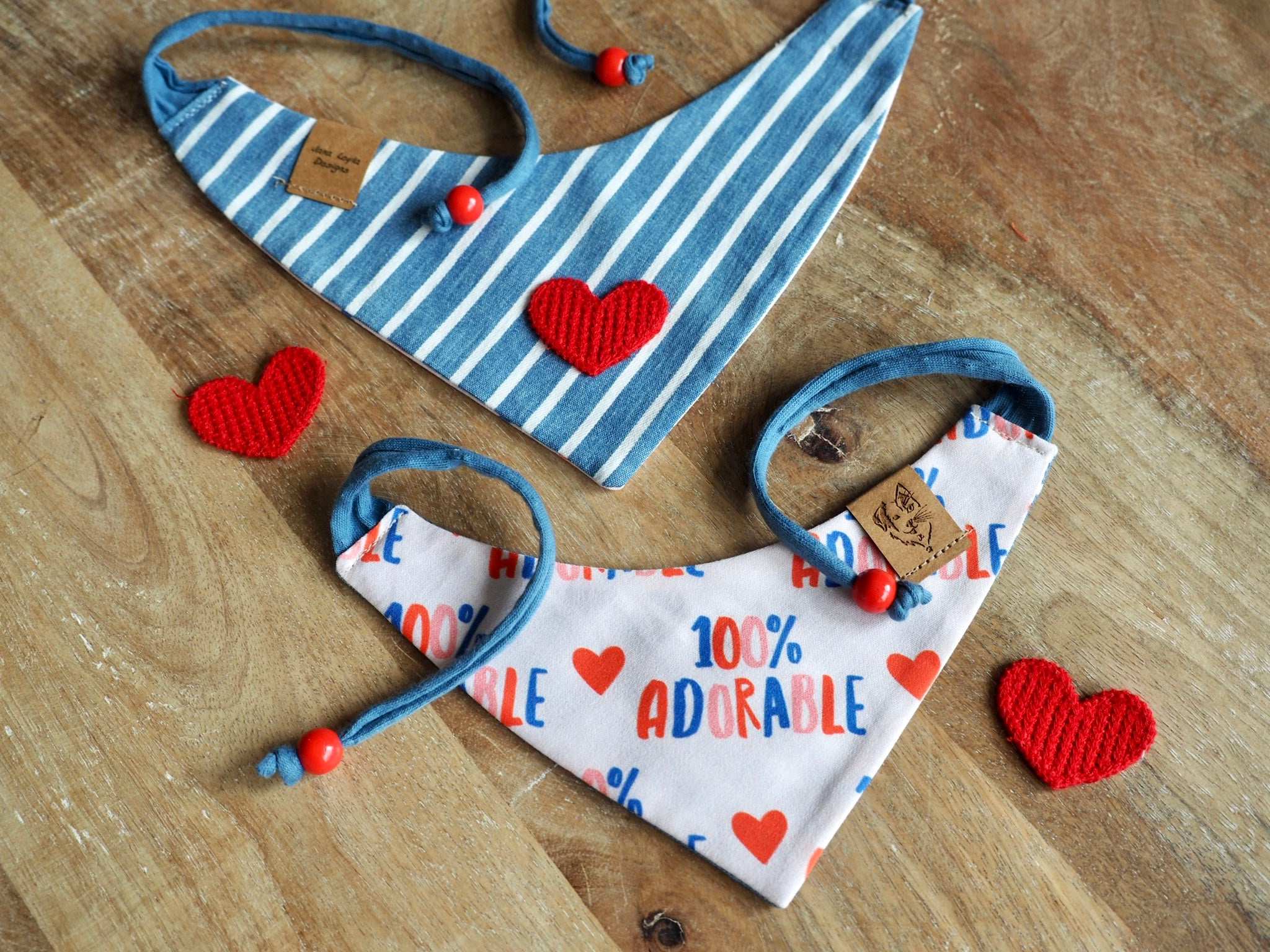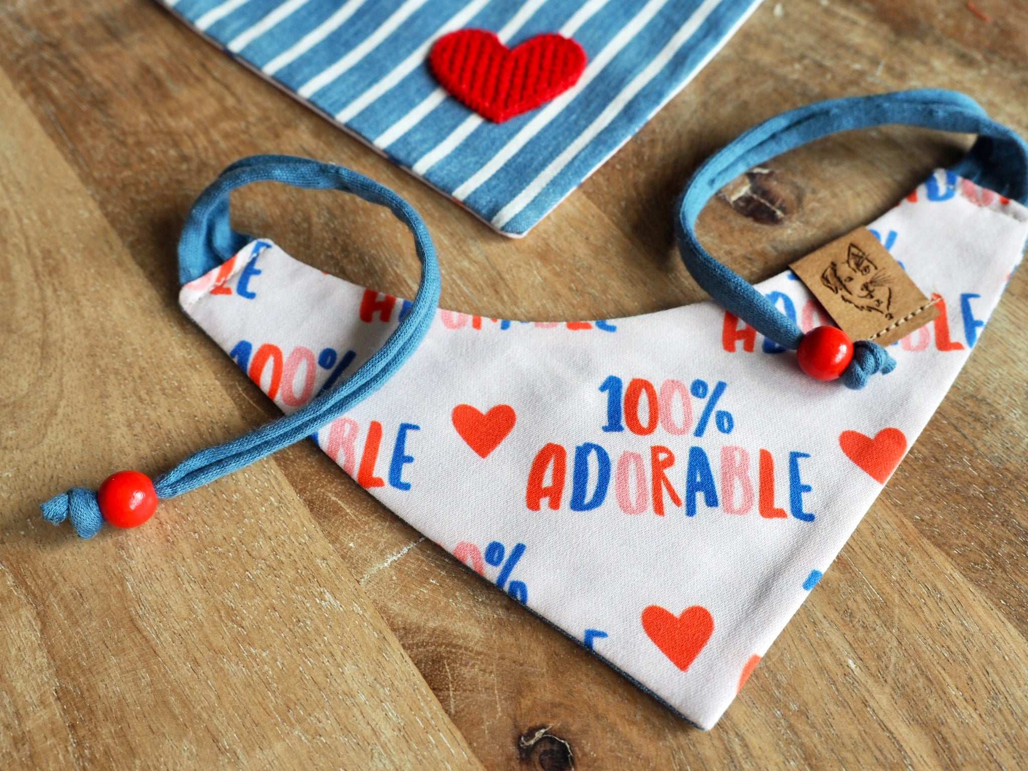Unsere Halstücher sind fast alle beidseitig tragbar, so dass ihr immer zwischen zwei tollen Designs wechseln könnt. In diesem Fall habt ihr also die Qual der Wahl zwischen 100% adorable Aufdruck und gestreifter Rückseite mit Herz.