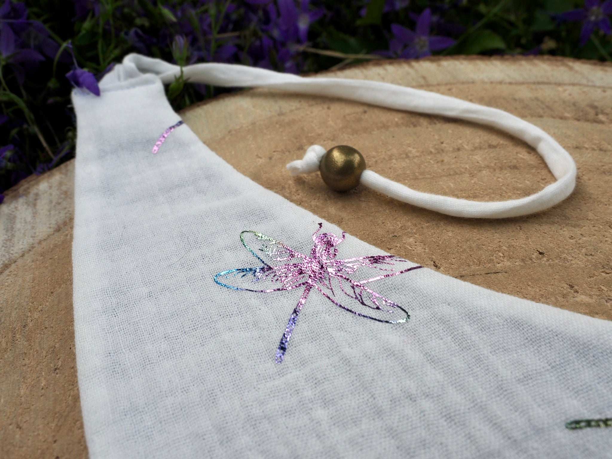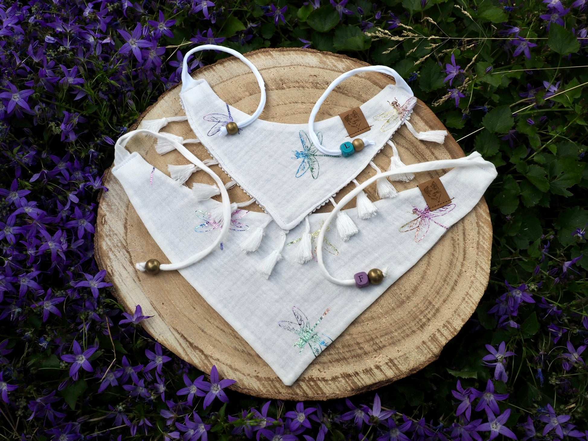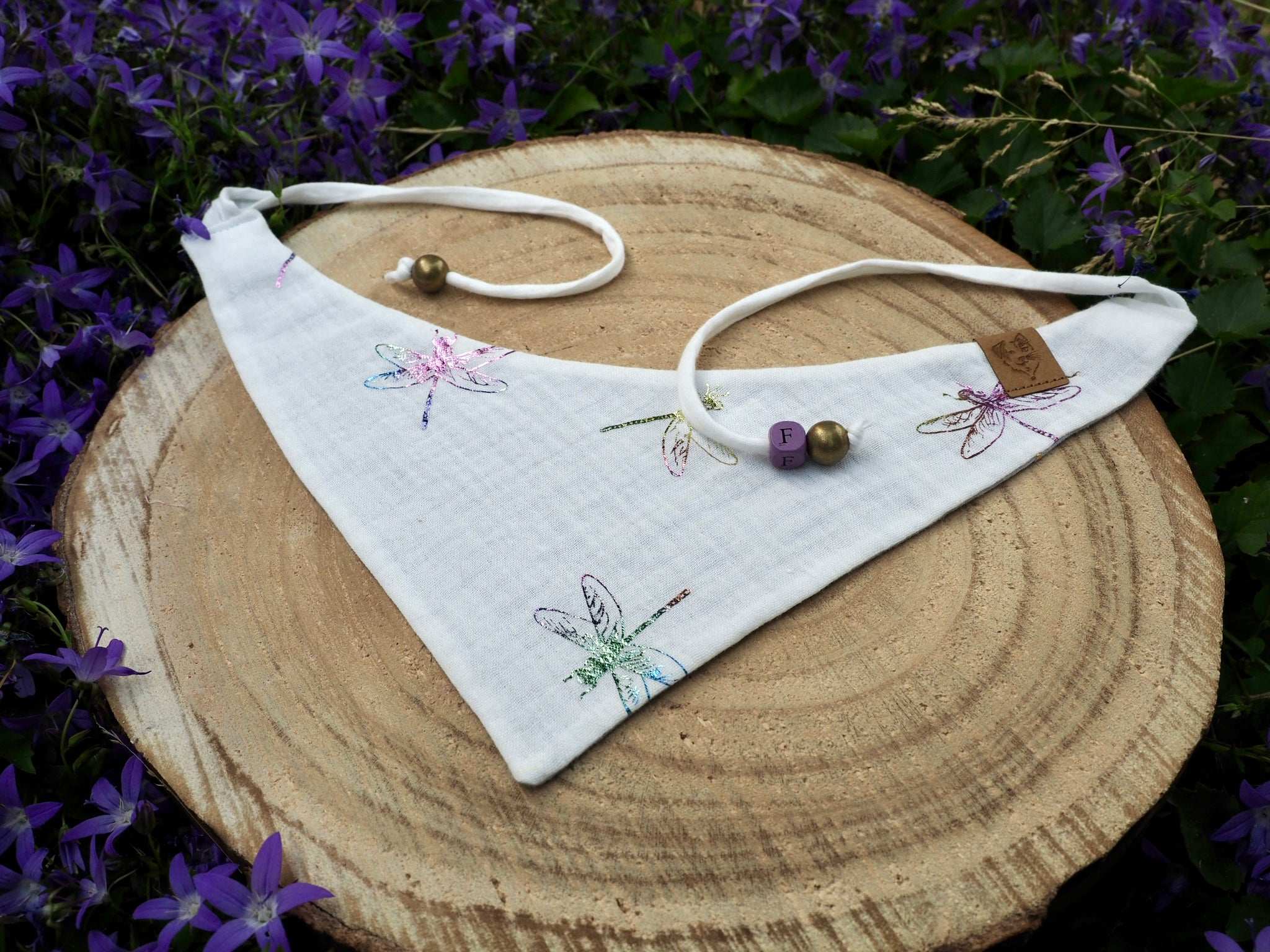 Mach deinen Vierbeiner zum süßen Eyecatcher mit unserem hochwertigen Hundehalstuch und Katzenhalstuch aus Musselin! Das edle Design mit glitzernden Libellen und goldenen Punkten sorgt mit Sicherheit überall für bewundernde Blicke - ob im Park, beim Stadtbummel oder beim Fotoshooting. Mit unserem schicken Halstuch sind eure Fellnasen bestens für den Sommer gerüstet :)
