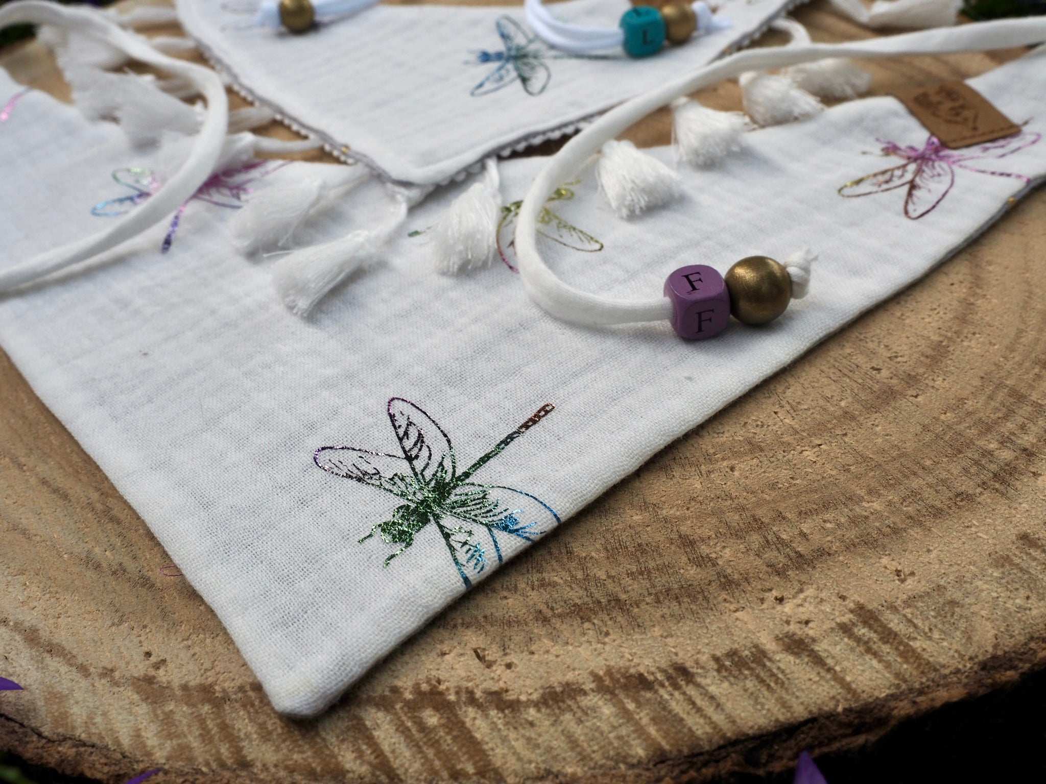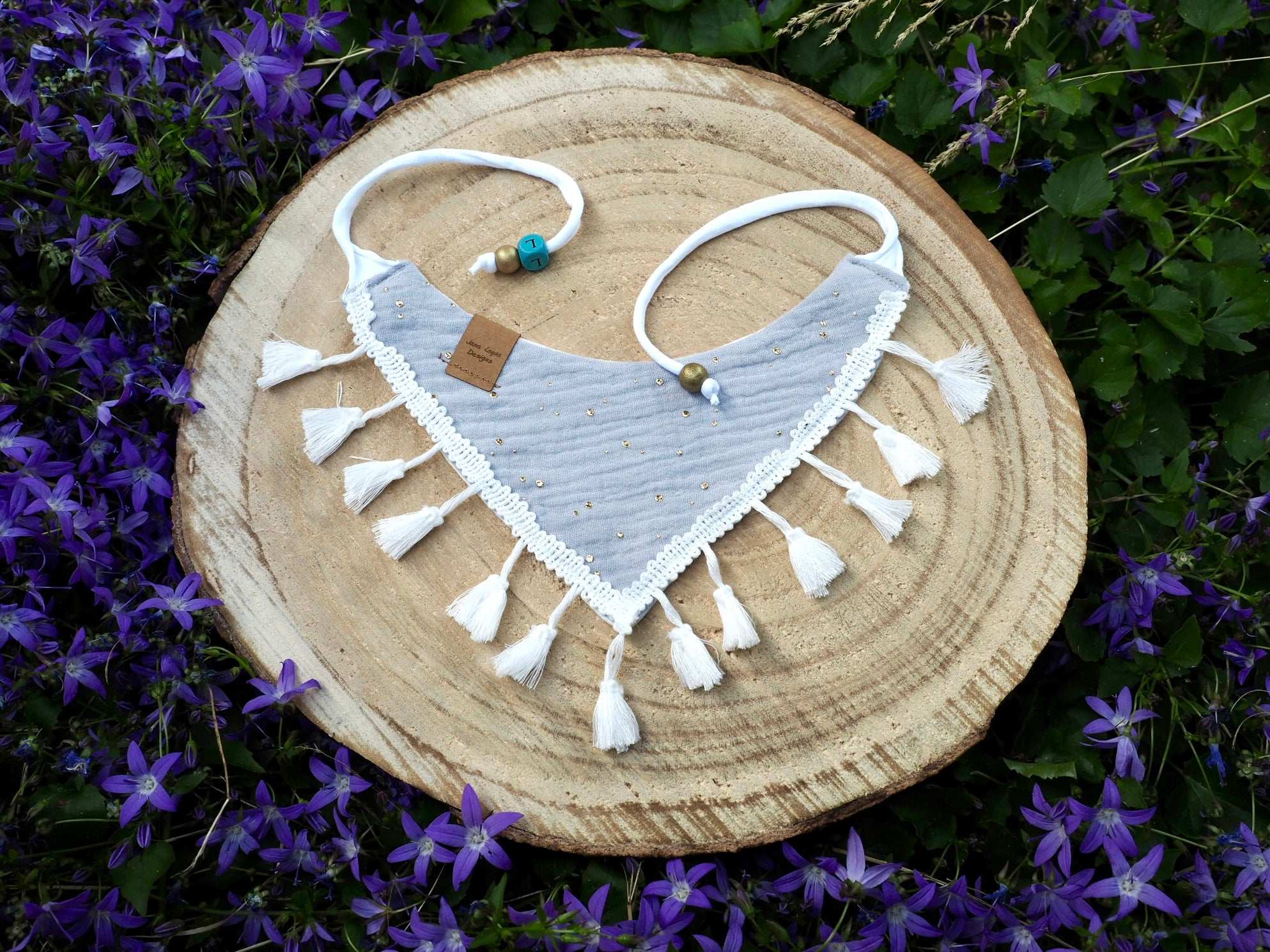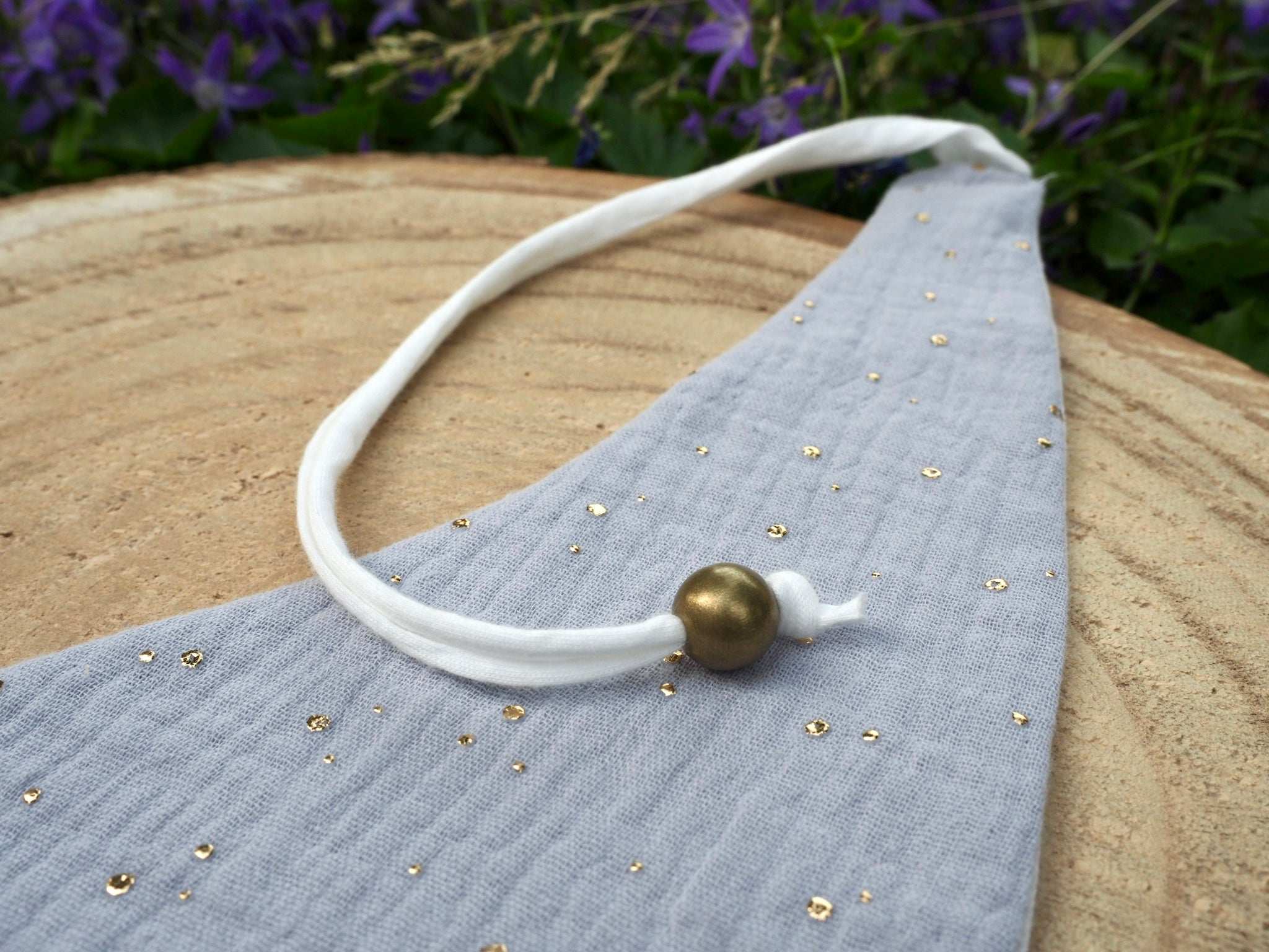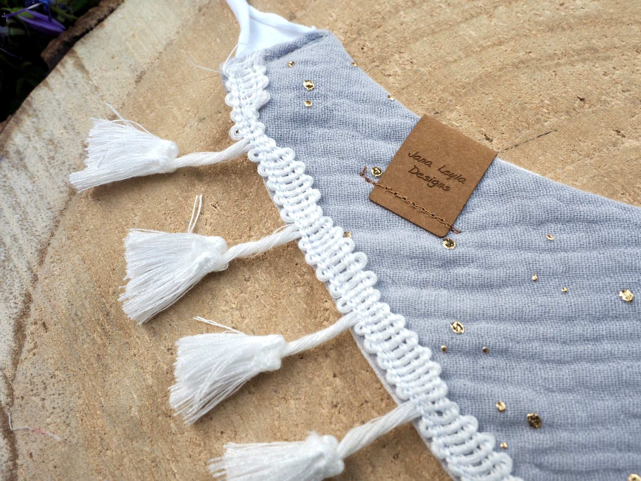 Materialzusammensetzung: 100% Musselin, Bänder: 100% recyceltes Textilgarn plus Holzperlen, Label: 100% veganer Lederersatz aus recyceltem Papier und Latex.