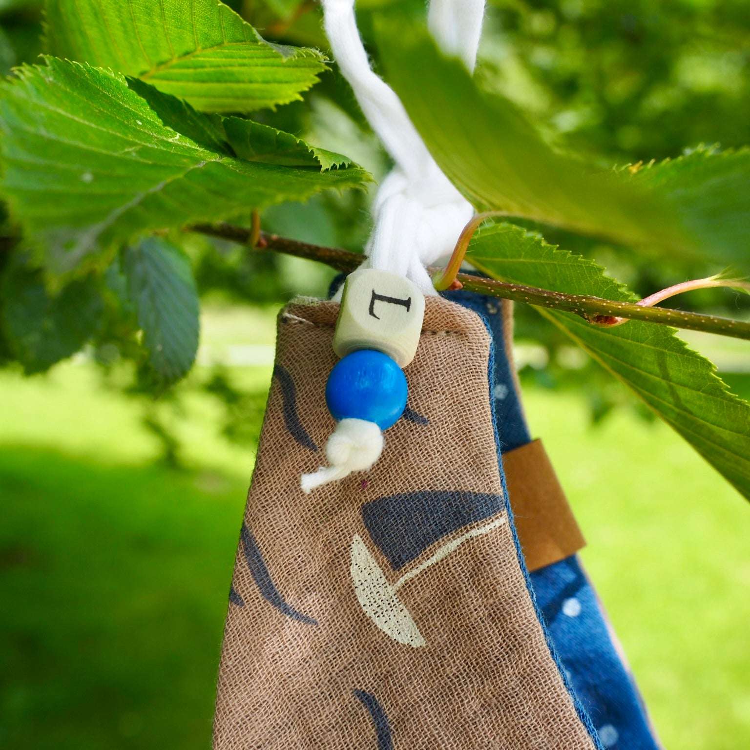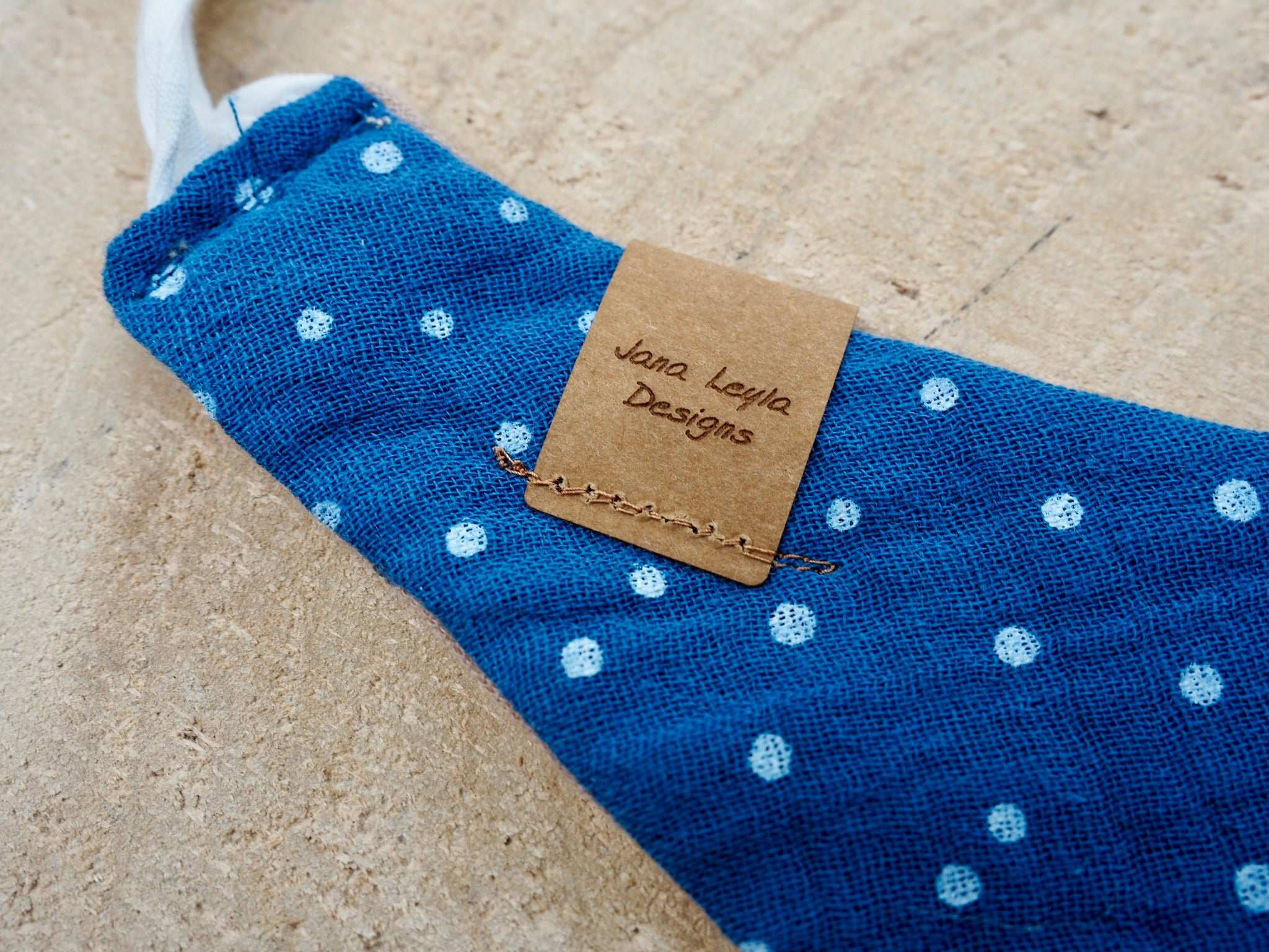 Materialzusammensetzung: 100% Musselin, Bänder: 100% recyceltes Textilgarn plus Holzperlen, Label: 100% veganer Lederersatz aus recyceltem Papier und Latex.