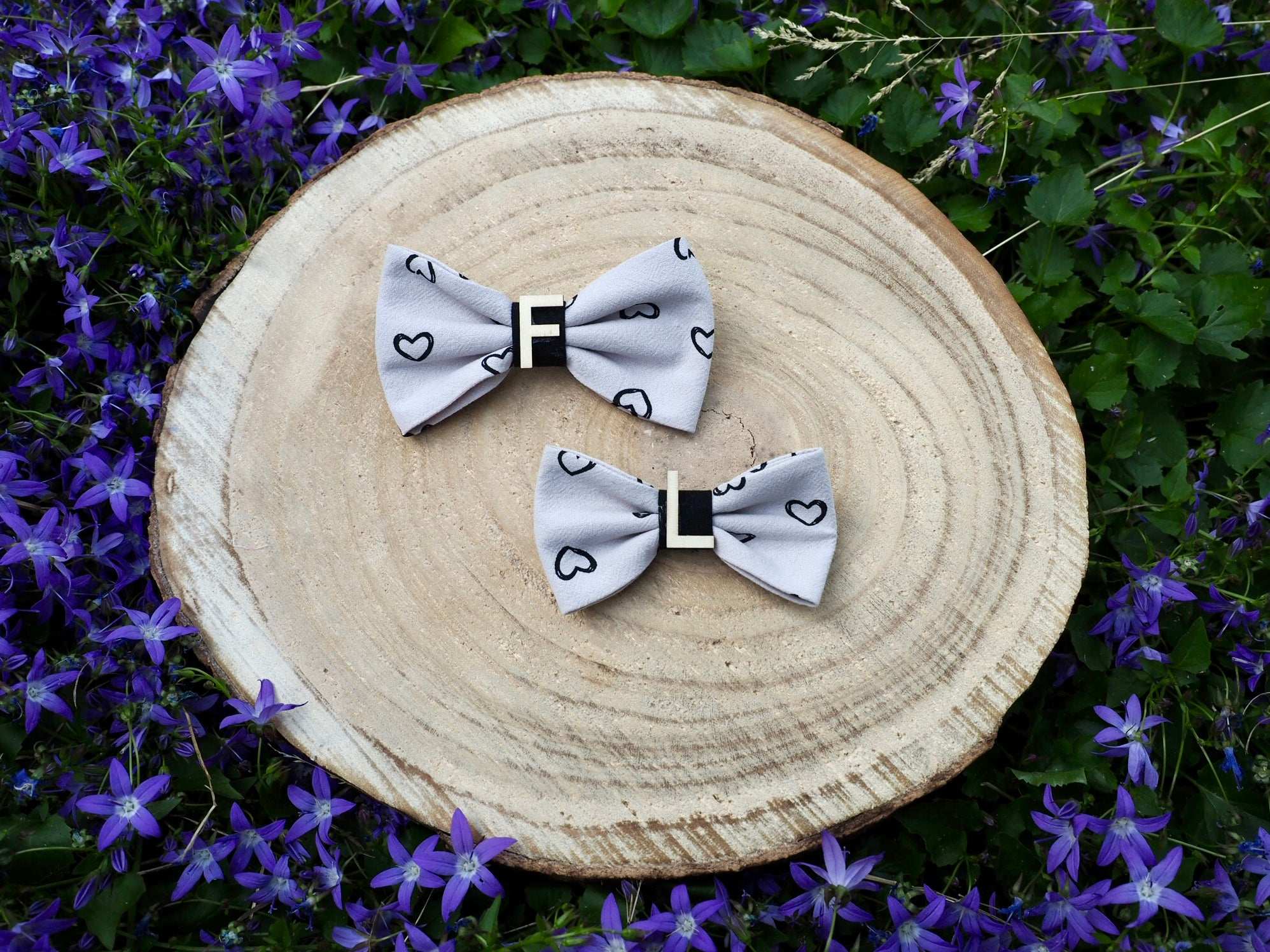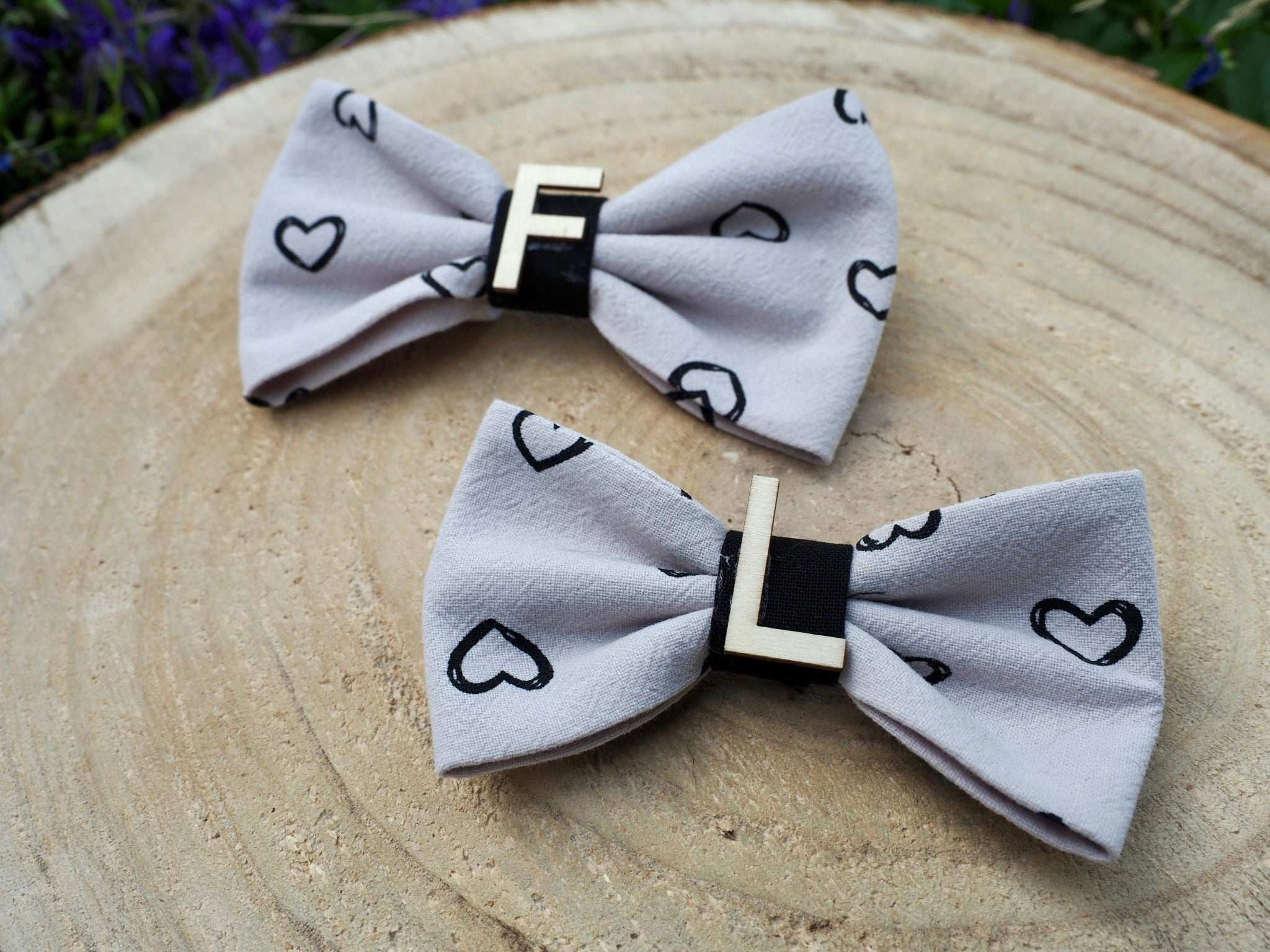 Diese zauberhafte Hundeschleife / Katzenschleife ist das perfekte Accessoire für deinen Vierbeiner! Das romantische Herzmuster auf beige-grauem Stoff verleiht der Schleife eine charmante und liebevolle Note. Besonders einzigartig wird die Schleife durch die Möglichkeit der Personalisierung: Gib bei der Bestellung den Namen deines Hundes oder deiner Katze in der Hinweis-Box an und wir fügen einen Buchstaben aus Holz hinzu :)