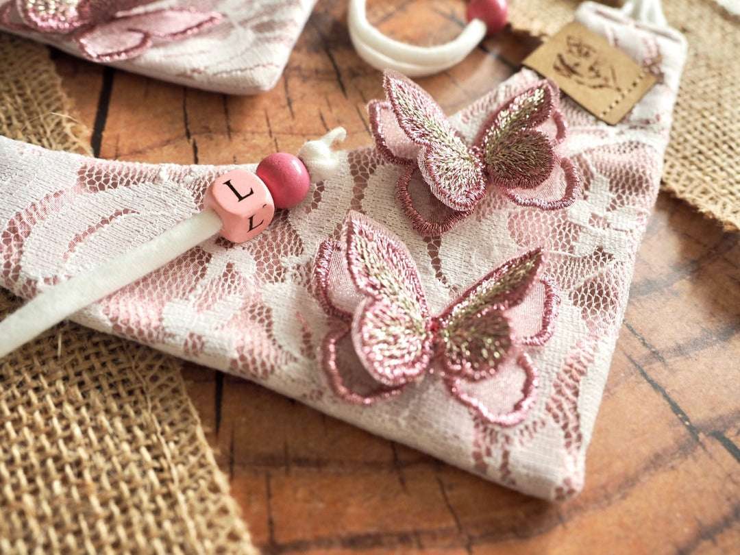 Zauberhaft schön zur Hochzeit - das gilt ab jetzt nicht mehr nur für die Braut, sondern auch für eure Vierbeiner :) Mit unserem handgemachten Hundehalstuch aus weißer Spitze auf rosa Satin-Stoff, verziert mit süßen Schmetterlingen, zieht euer Hund mit Sicherheit alle Blicke auf sich und ist perfekt ausgerüstet für jede Hochzeit!